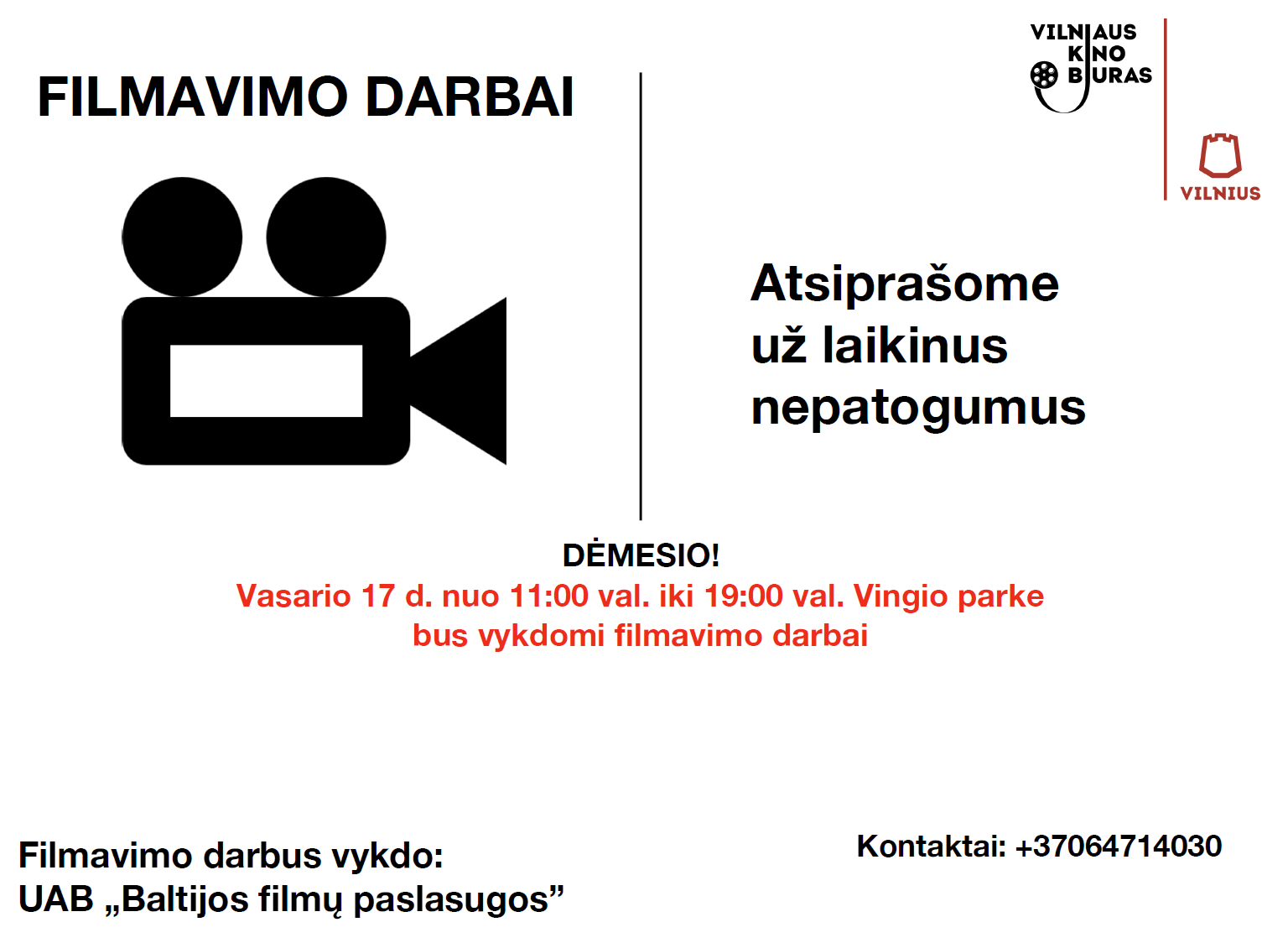 Vasario 17 d. 8–19 val. Vingio parke vyks JAV kino kūrėjų tarptautiniai filmavimai. Techninis transportas bus statomas prie Vingio parko estrados. Filmavimas vyks vaidybiniam automobiliui važiuojant Vingio parko pėsčiųjų takais. Filmavimo metu trumpam (iki 3 min.) bus ribojamas pėsčiųjų ir dviratininkų eismas. Pasiruošimas vyks nuo vasario 14 dienos.